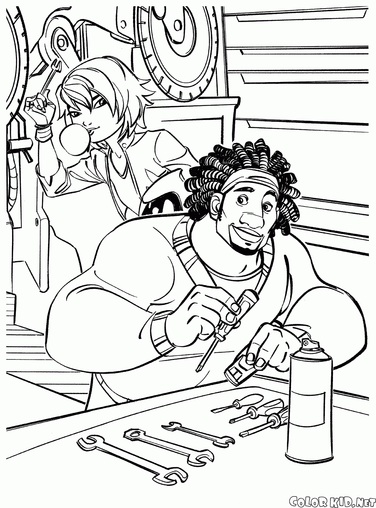 Wasabi and GoGo Tomago are creating something new. Wasabi has all his tools distributed in an orderly fashion, abut GoGo will probably snatch the instrument she needs and run away to tinker on something.