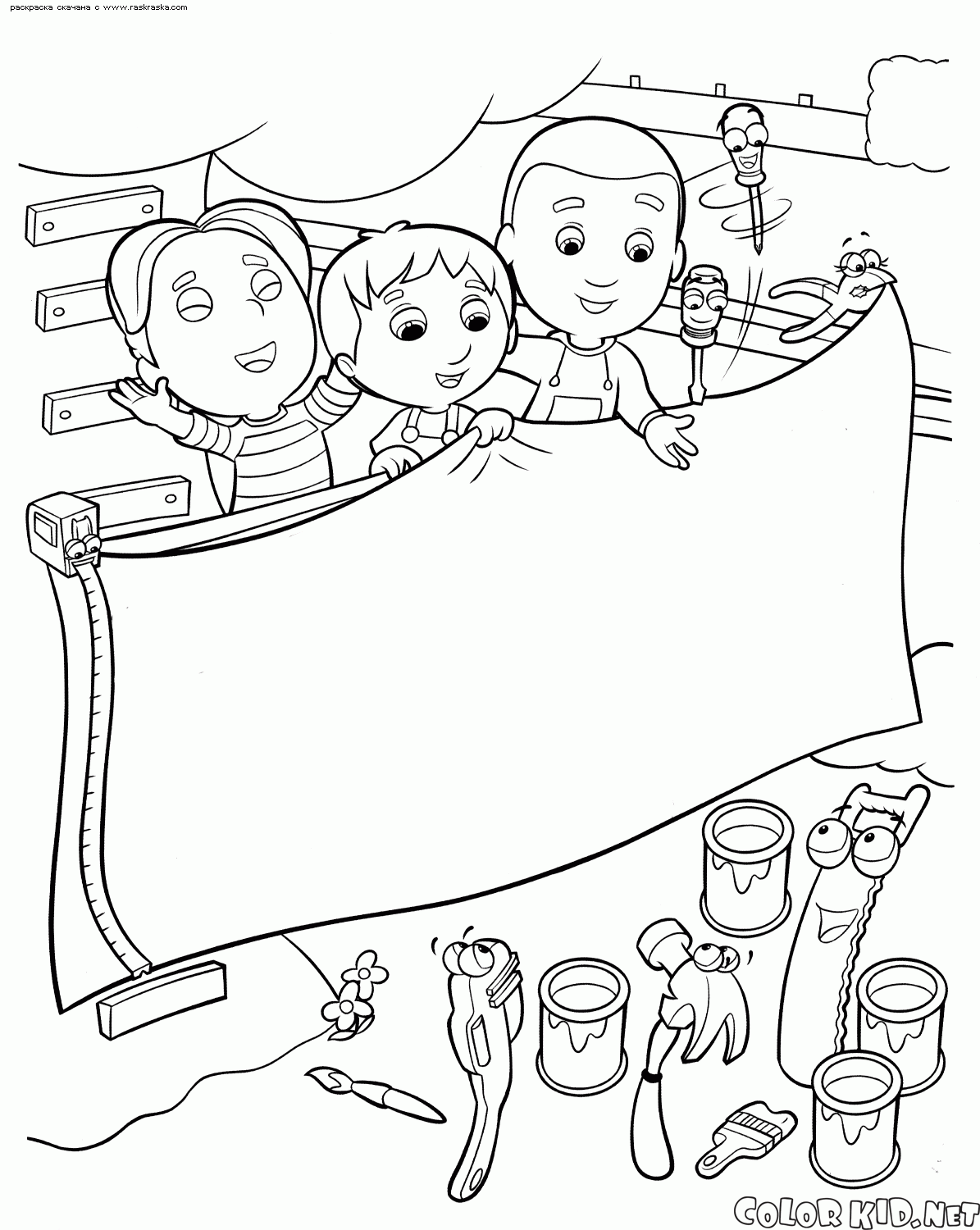Kids and instruments are making a poster together. Children are holding the poster, a ruler has measured the height of a sheet. The rest of instruments have prepared a paint and brushes and prepared to draw a congratulation poster.