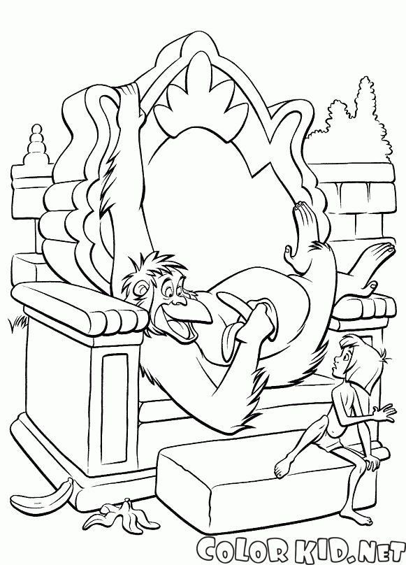 Mowgli escapes from the lair of monkeys and gorillas. The king of monkeys is laying on the throne and eating bananas. Luckily for Mowgli, apes are quite forgetful.