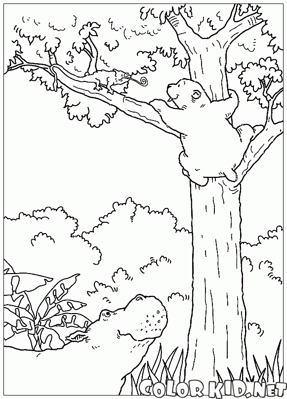 A bear cub is trying to get a chameleon from the tree. This amazing animal can catch flies with his quick and changes color to hide in his surroundings. A hippo is wondering what our quick Lars is up to.