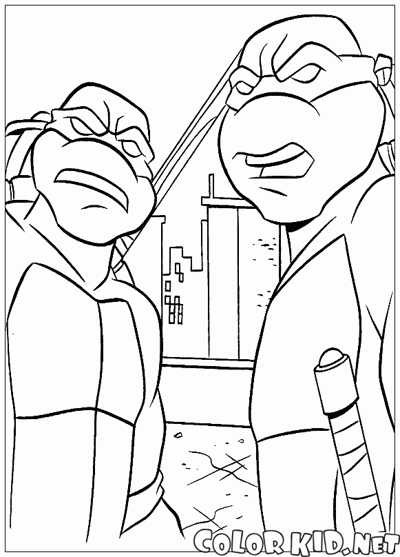 Two ninja turtles are looking at something in surprise. They are standing on a roof of a building and there are big city skyscrapers behind them. One turtle has a samurai sword on a belt.