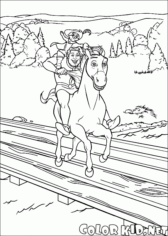 A fast journey of our friendly crew after the transformation. Shrek is riding on a white horse the donkey turned into and carries a cat on his shoulder. They ride fast on a timber bridge.