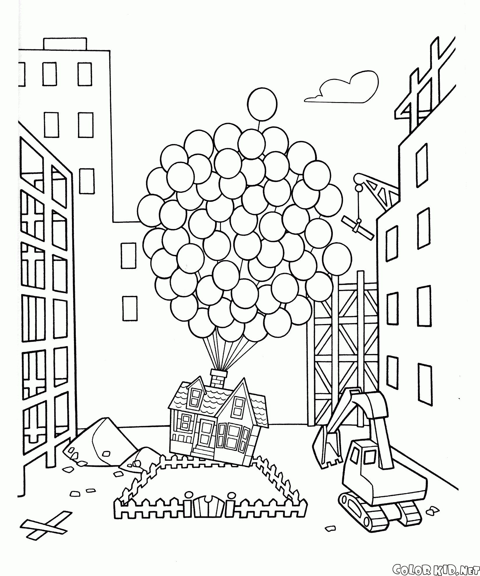 Several minutes before the demolition of the house Carl has started the flight. The builders are ready to destroy his old house with an excavator and build something else. Construction is going on all around and in the last moment old inventor manages to save his home.