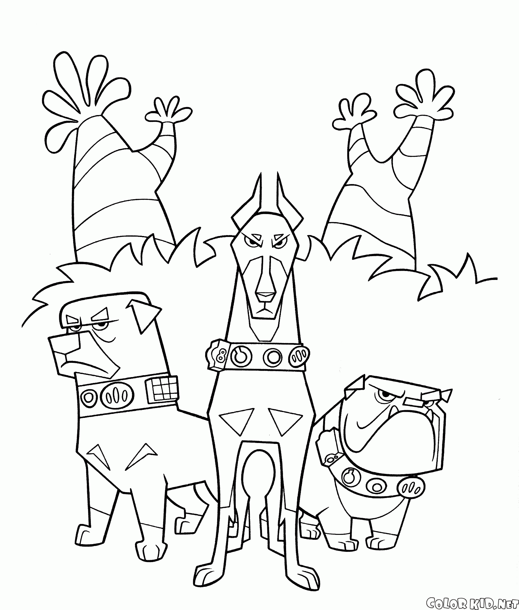 Three talking dogs are on guard. Alpha, Betta and Gamma are working for Charles Muntz, the main villain. Doug was in their pack once.