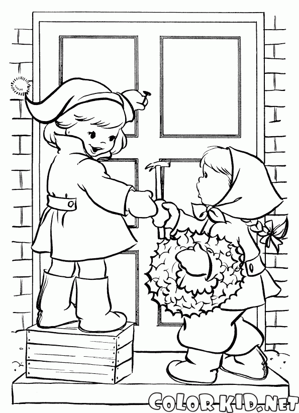 You can download and print out the coloring pages for kids Children hang a wreath from our website.